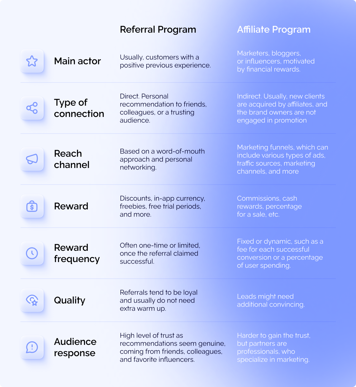 Affiliate and referral programs might sound similar, but they’re different at their fundamentals. For starters, an affiliate program involves one advertiser, who encourages professional marketers to promote their brand and attract more users in exchange for some payment. Basically, partnering with an affiliate program is full-scale work aimed at long-term cooperation.