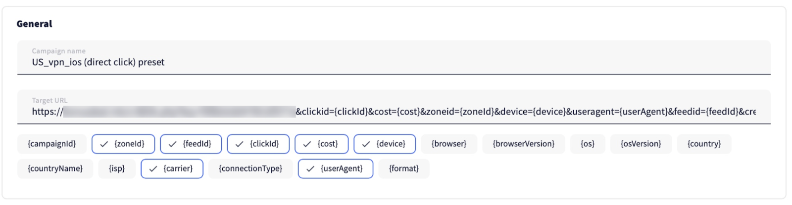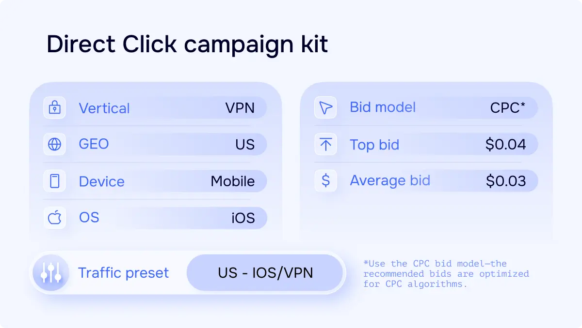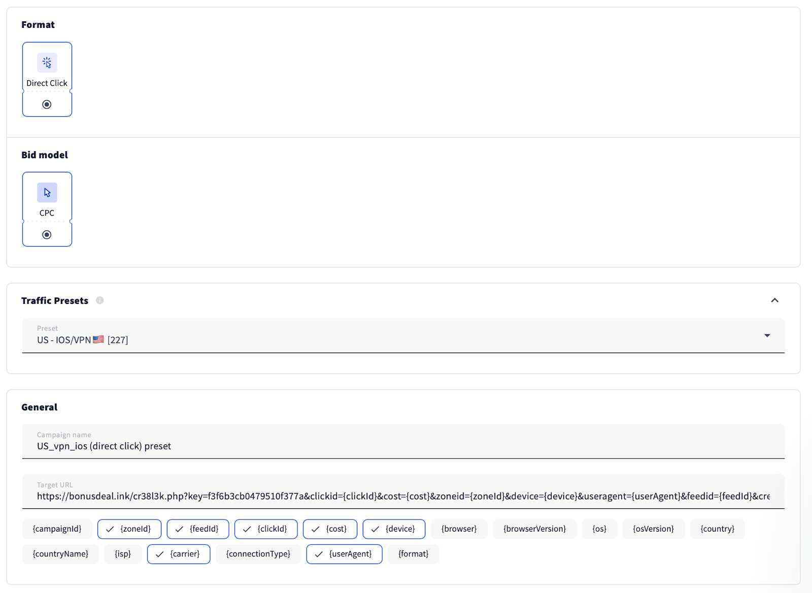 Let’s roll with our campaign. We picked the Direct Click ad format and the СPC bid model. After that, in the traffic preset tab, we found the preset indicated in our campaign kit: US – IOS/VPN 🇺🇲.