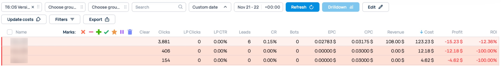 We also noticed that one OS version was driving the majority of the traffic. We added it to the targets to avoid losing clicks on other versions, which generated less traffic and no conversions.