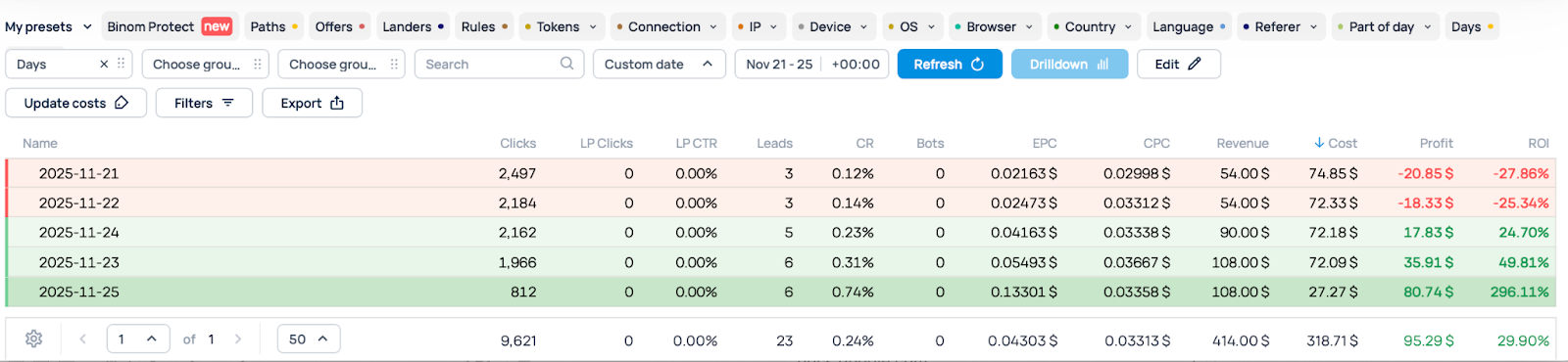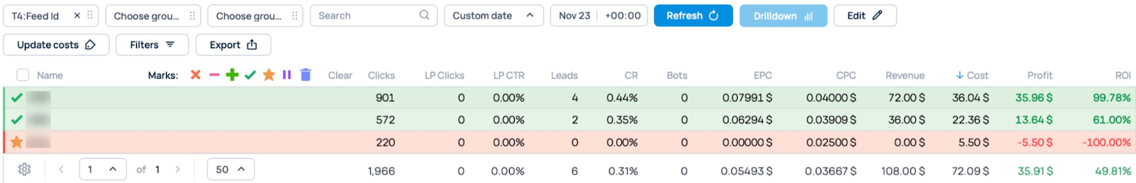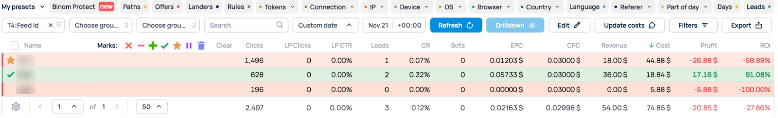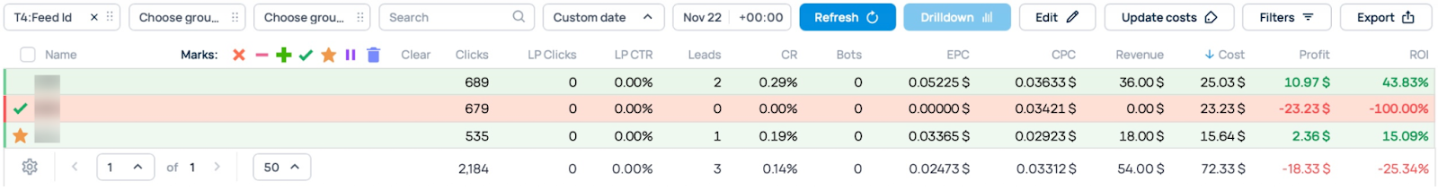 After setting the sampling period to 2 days, we saw that the second feed in terms of traffic volume also didn’t generate any conversions, so we switched it off without hesitation.