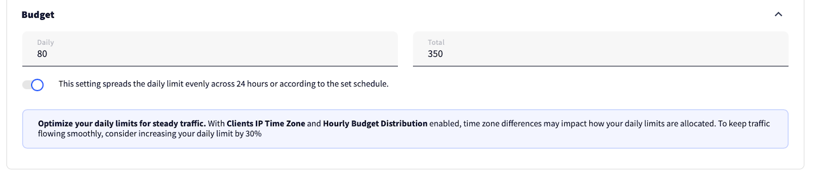 One important thing to note: you need to set a daily budget, because you don’t know how much traffic is included in the preset or how fast your budget will be spent. You can also set a total budget, but unlike the daily budget, this is optional and depends entirely on your preference.