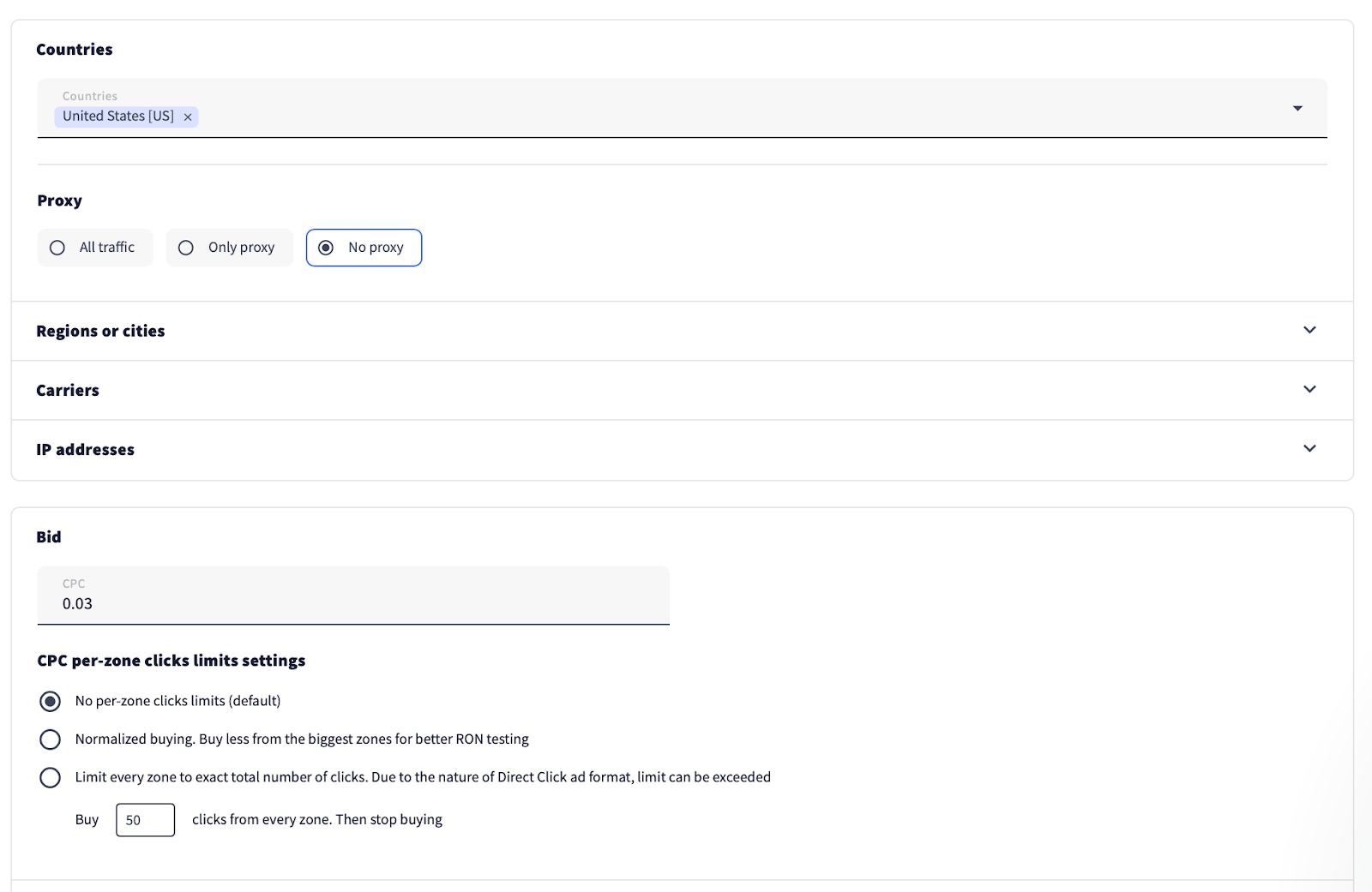 It’s important to use the CPC bid model here, as all bids were specifically collected to work with CPC algorithms. Make sure to select the correct bid model when setting up your campaign.
