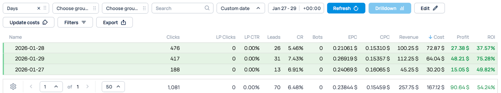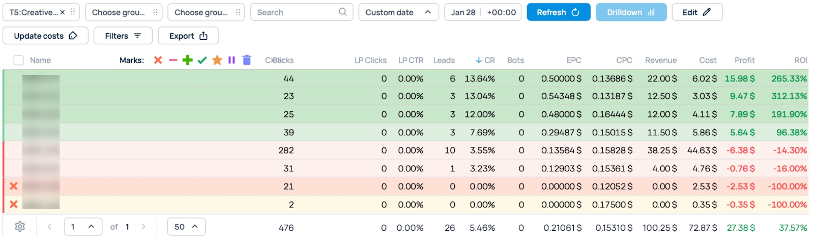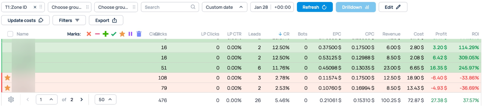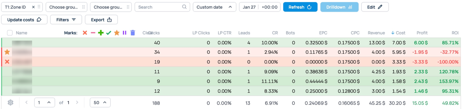 However, even with good results, we still optimize traffic channels to improve performance. We blocked a zone with no conversions and slightly lowered the bid for a zone with -32.77% ROI to move it into the green.