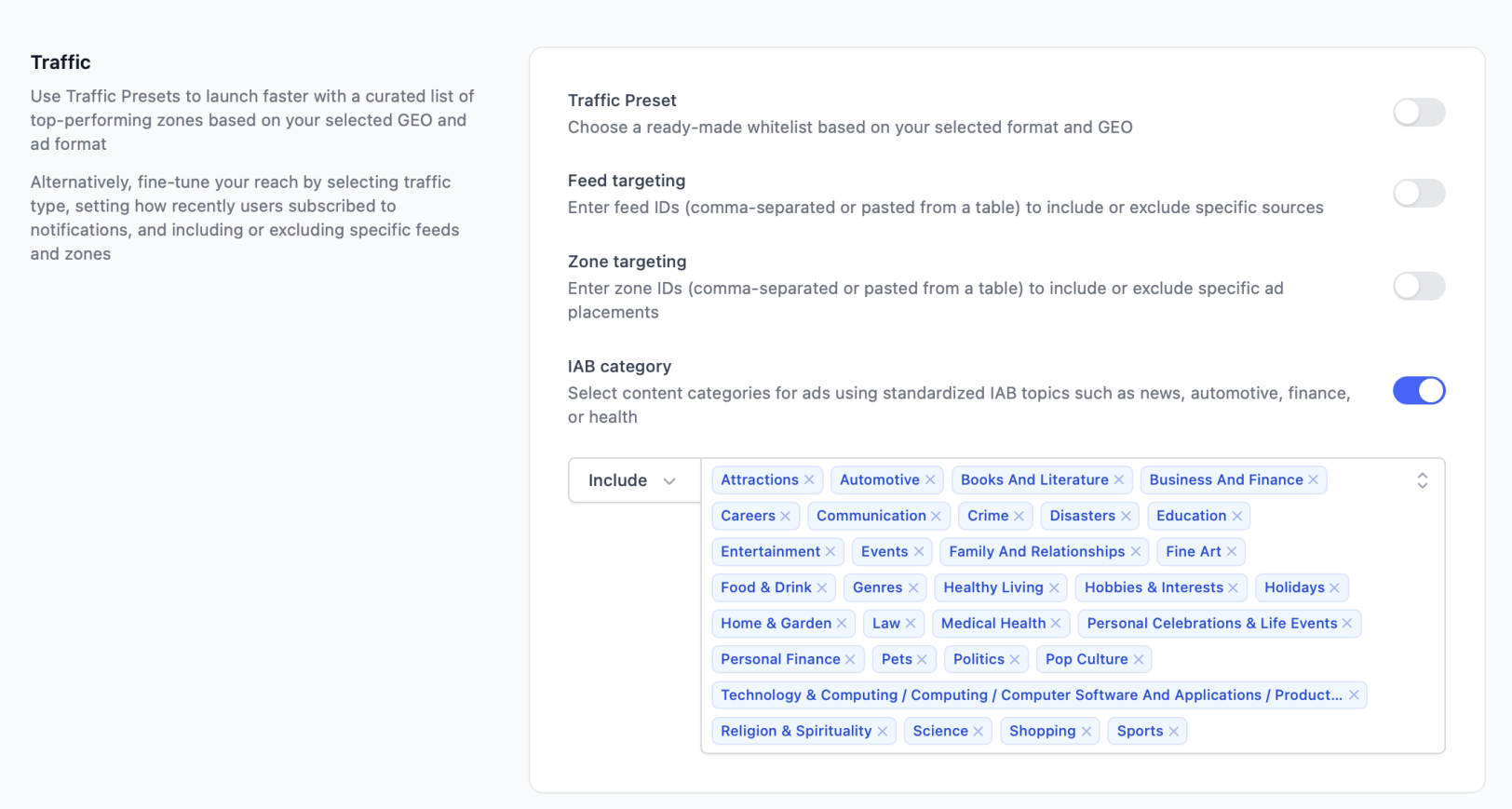 - Simplified optimization. This is where IAB targeting makes the biggest impact. Rather than optimizing zone by zone, you can manage traffic on a category level. By disabling a single IAB category, you can instantly exclude hundreds of underperforming zones that would otherwise continue draining your budget.