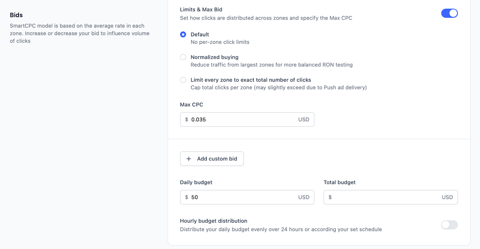 Step 6: Following our manager’s recommendations, we set a maximum CPC of $0.035 (relevant at the time of the campaign launch—it may be different when you read this article) and a daily budget of $50.