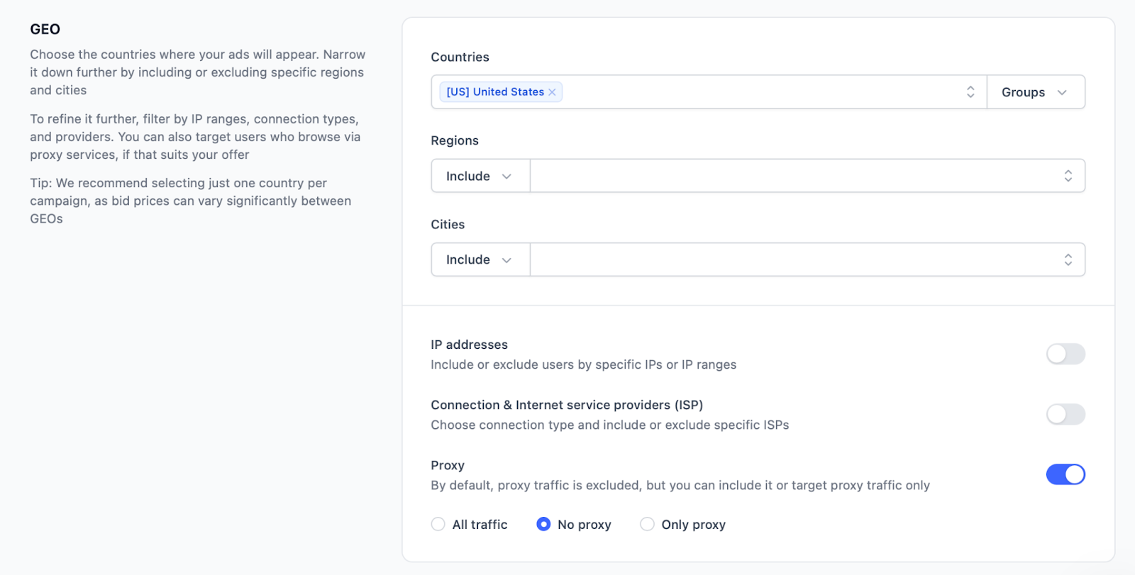 Step 3: We selected the targeted country and disabled proxy traffic.