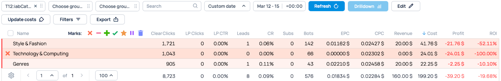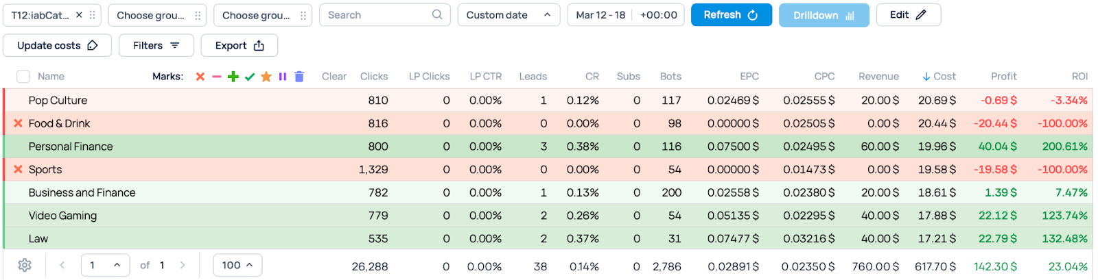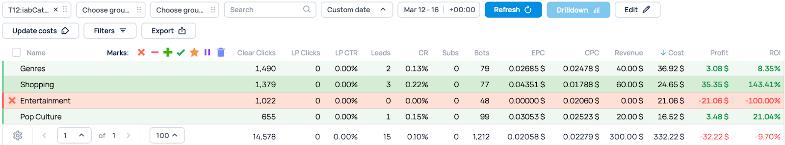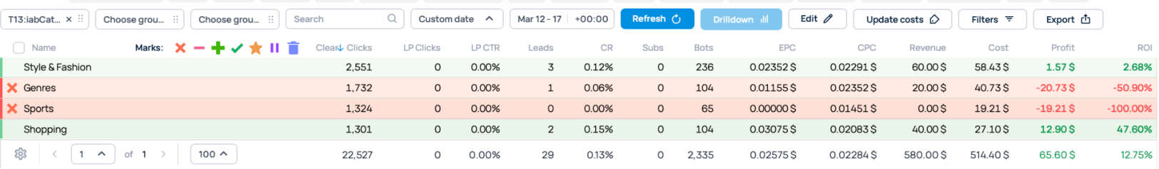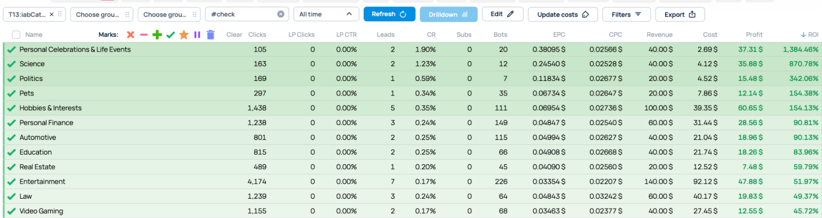 We switched off two IAB categories: one that ended up in the red and another that brought in no conversions. In our case it was Genres and Sports.