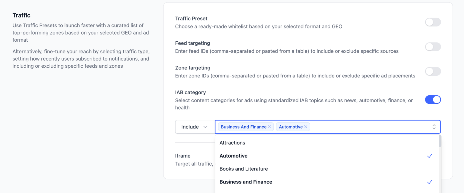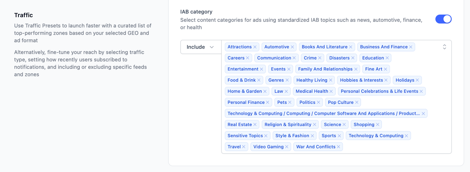 When setting up your campaign, you’ll see the IAB category option in the Traffic section when creating your campaign, letting you select one or multiple categories to make your Direct Click campaigns hit the mark.
