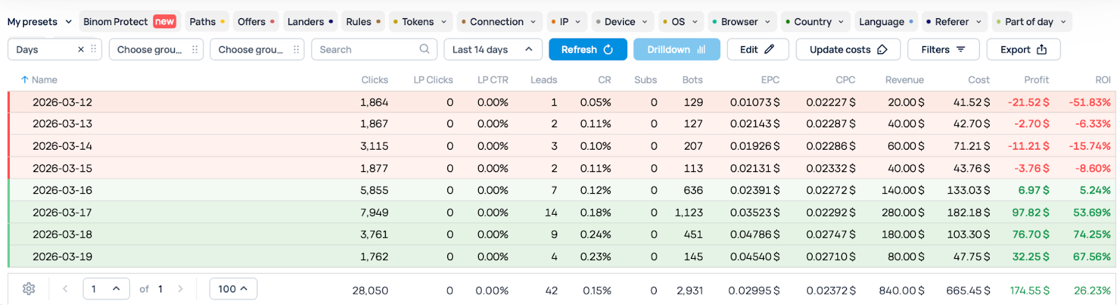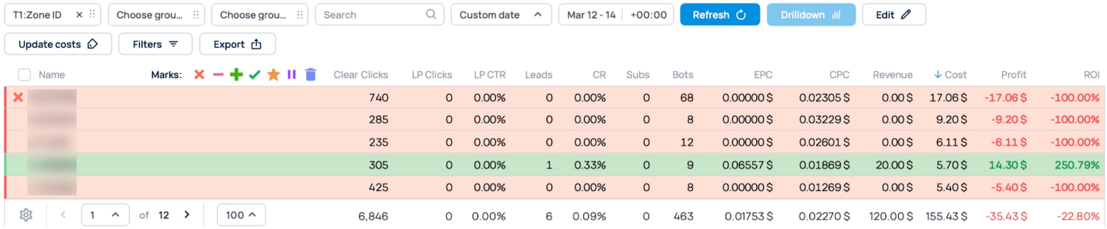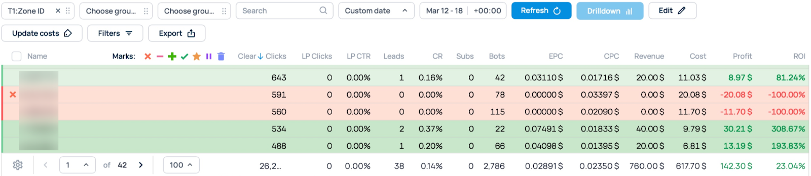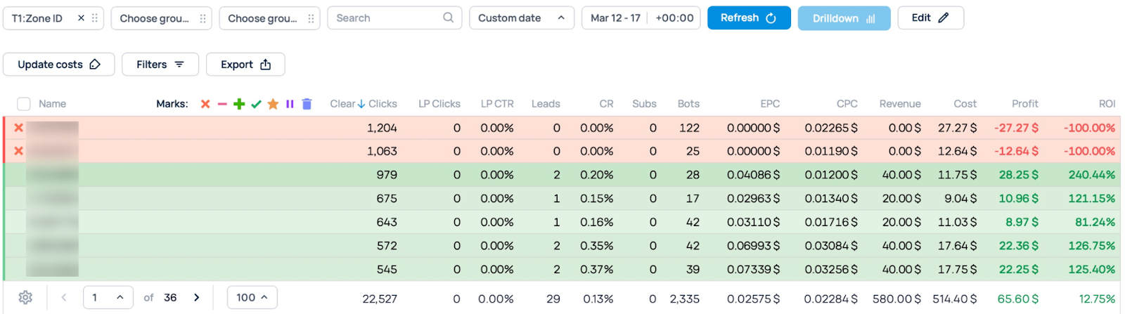 We sorted all zones by the total number of clicks they accumulated during the campaign so we could see the full picture and block those that generated the most clicks without producing any conversions. So, goodbye, underperformers!