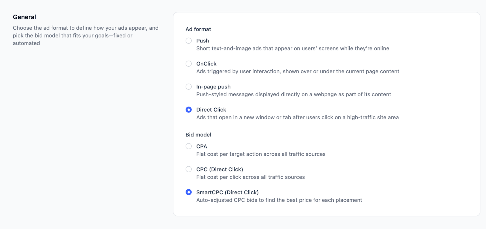 Step 1: We selected the ad format and bidding model.