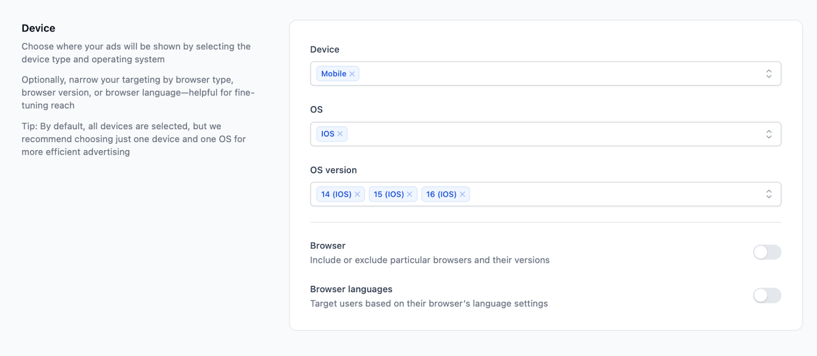 Step 4: Next, we targeted by device, OS, and OS version—here we simply followed the offer’s requirements.